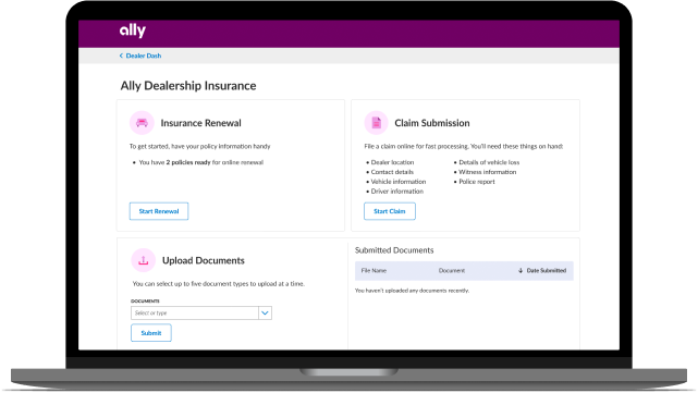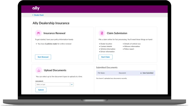 You’re in the right place. To get started, select the claim type that applies to you. For help with reporting other claim types, contact your Ally Dealership Insurance Account Manager.