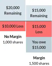 The value of the stock you bought goes down to $20. With the 1,500 shares you bought on margin, your total portfolio is worth $30,000. If you decide to sell at this point, you still have to pay back the $15,000 you borrowed, so you’re actually left with $15,000. If you hadn’t borrowed on margin, you’d have $20,000 of your money left.