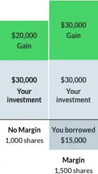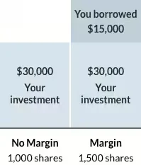 Using your own money, you could purchase 1,000 shares at $30 per share. If you use margin, you can increase the number of shares you can buy. Let’s say you buy 1,500 shares. At this point your total portfolio with margin would be $45,000, instead of the $30,000 you could’ve bought with just your money.